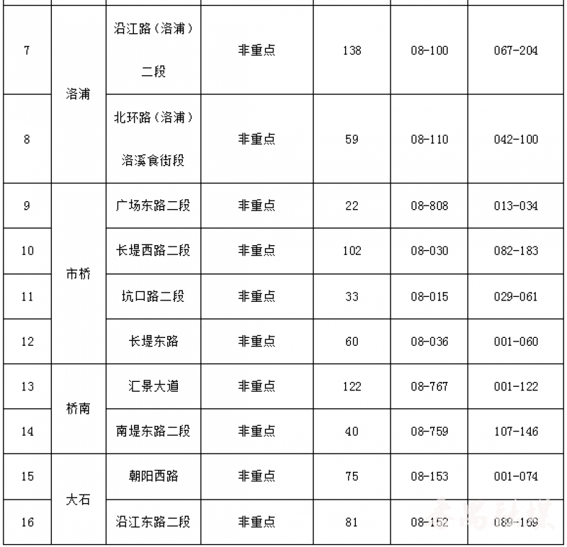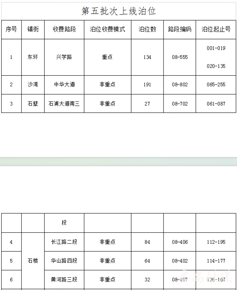 番禺区市桥街、桥南街、大石街、洛浦街、石楼镇等8个镇街、16条路段内共1264个城市道路临时泊位(含重点区域泊位134个、非重点区域泊位1130个),收费范围详见下表: