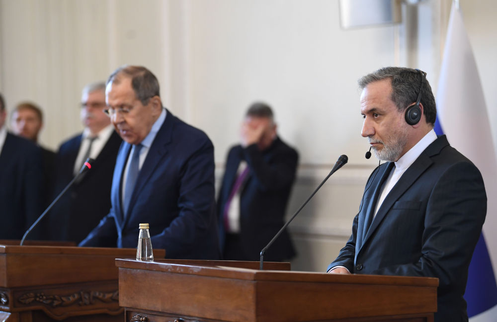 2025年2月25日,在伊朗德黑兰,伊朗外交部长阿拉格齐(右)与俄罗斯外长拉夫罗夫出席联合新闻发布会。新华社记者沙达提摄