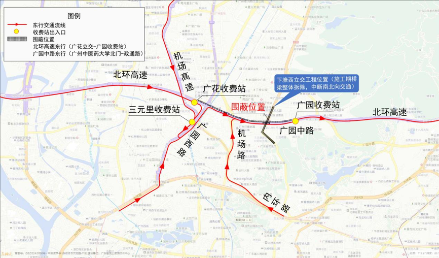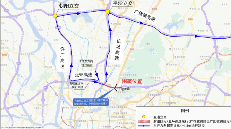 根据施工计划,广园路下塘西路立交大修工程将于4月19日凌晨(0:00~6:00)临时中断北环高速(广花出口至广园路入口路段)东行方向和广园中路(广州中医药大学北门至政通路路口路段)东行方向交通,开展跨北环高速桥梁拆除围蔽施工,请过往车辆注意绕行。