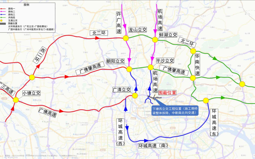 路线一:广三高速→小塘立交→西二环→北二环;广佛高速→广清立交→许广高速→广佛肇高速