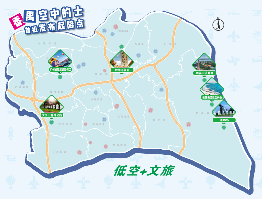首批布局的25处起降点中就有6处位于旅游景点,涵盖广州长隆旅游度假区、莲花山旅游区、岭南印象园、莲花山游艇会码头、大夫山森林公园、海鸥岛,随着起降点建设的完善,搭乘番禺“空中的士”便可空中游览。番禺“空中的士”还将联通山海,以“岭南印象园—莲花山风景区”向东串联邮轮母港的滨海活力长廊,向南直抵珠海九洲客运港的百岛风情门户,开启“一日阅尽岭南韵”“一程揽尽湾区景”的空中之旅。