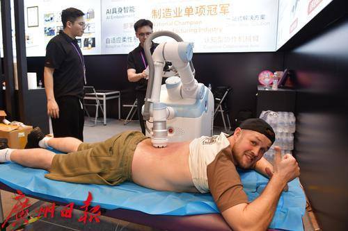 境外采购商体验理疗机器人。