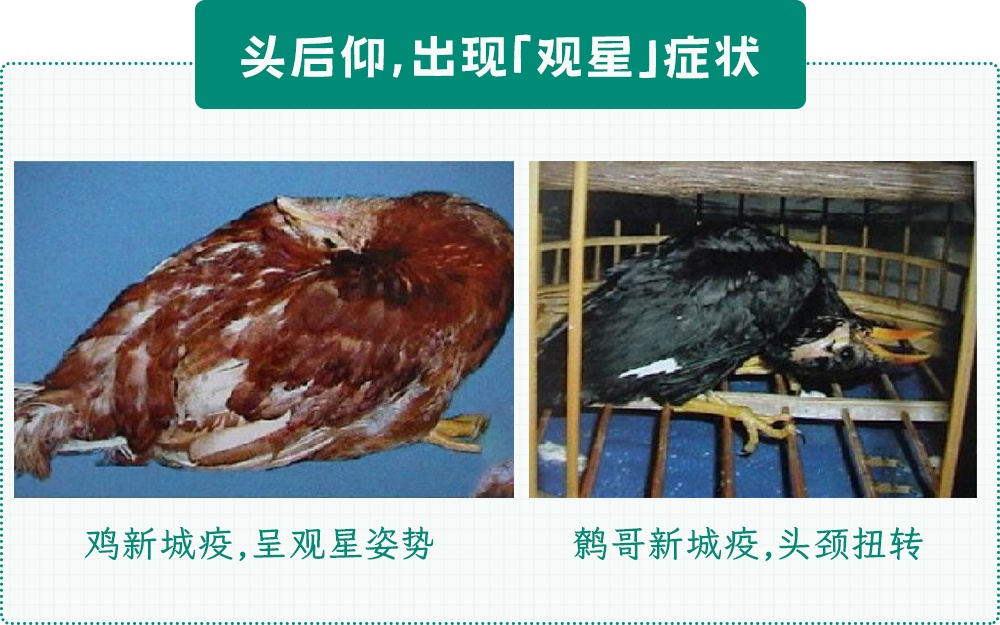 这种颈部扭转、头部后仰、呈望天状的姿势,医学上称为“观星”,是新城疫的典型症状。靠近或抚摸患此病的鸟类,病毒可能沾染到人的皮肤、衣服和鞋袜上。