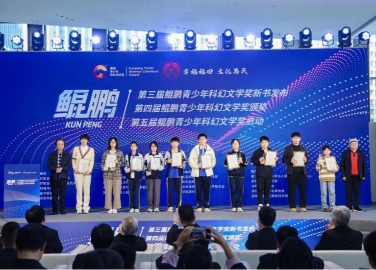 2021年,福田区教育局联合多方力量,重磅推出“鲲鹏全国青少年科幻文学奖”,这是国内首个专门面向25岁以下青少年的科幻文学奖项。大赛采用“创作—评审—出版—国际传播”的全链条培育机制,为青少年科幻爱好者搭建了专业、规范的展示平台。自设立以来,赛事规模不断扩大,截至 2024年,已成功举办4届,累计吸引来自全国近10万篇稿件参赛,评选出大奖89个、入围奖1600余篇,并出版了13部获奖作品。2025年启动的“鲲鹏出海”计划更是成果斐然,《太阳熄灭》电子版由美国 Tor 青少年出版社全球发行,《触不可及》英文版与企鹅兰登书屋签约并入选“雨果奖”得主推荐书单,让中国青少年科幻作品成功走向国际舞台,实现跨文化传播。