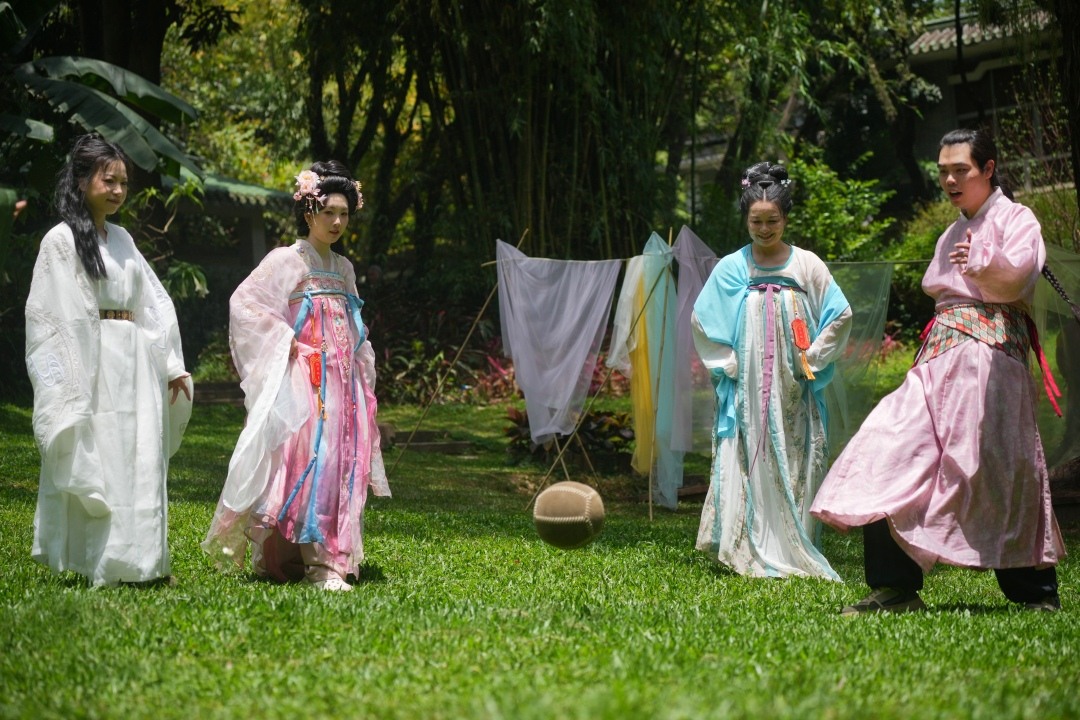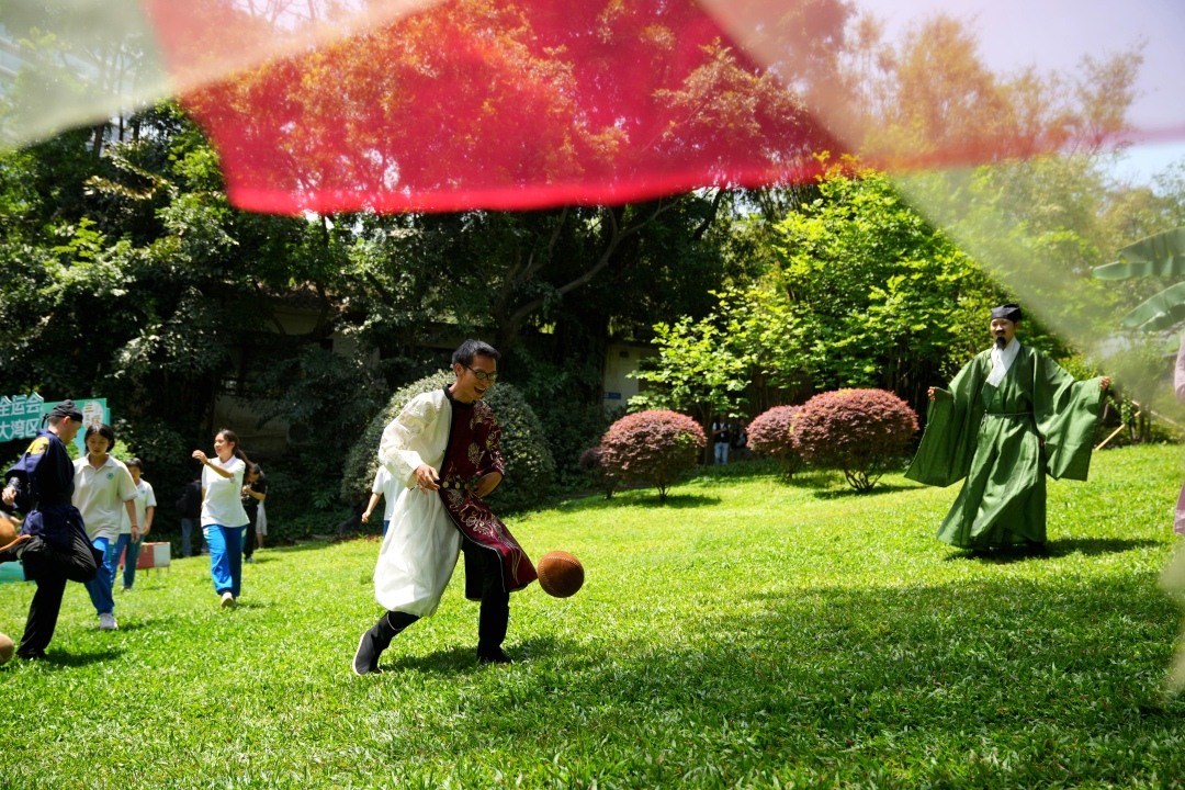 宋人笔下“蹴鞠场边万人看”的热闹,在兰缘盛荟重现。十五运会广州赛区的首项体育比赛——U16女子足球赛将于5月在越秀区举办,越秀区特别策划了“喜迎全运·国潮蹴鞠赛”,开展十五运预热。这场别开生面的国潮蹴鞠赛在兰圃落羽杉大草坪上演,主办方把草坪复原成古代蹴鞠的竞技场景,现场开展技巧展示、白打及对抗友谊赛。