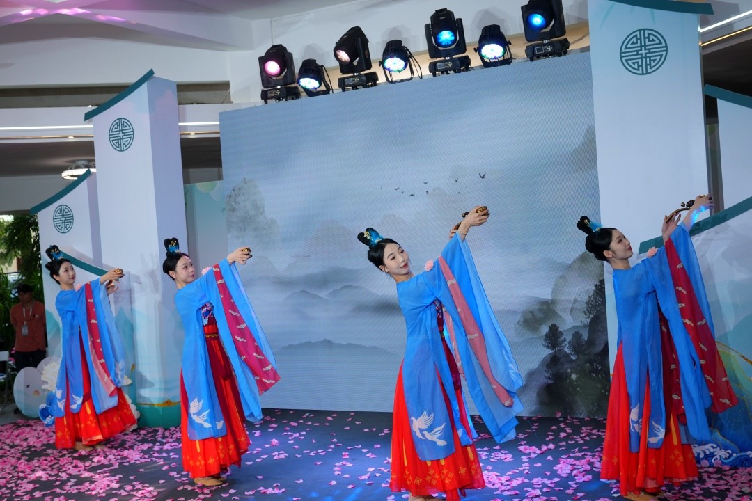 在落羽杉大草坪一旁的借云庄阶梯处,广东工业大学艺术与设计学院服装表演专业模特队带来“裳影风华”时尚秀,展现国家级非遗代表性项目香云纱染整技艺制作。现场还有国家级专精特新“小巨人”企业广州成至智能机器科技有限公司开展无人机撒花表演,以“文化+科技”创新文旅体验新场景。