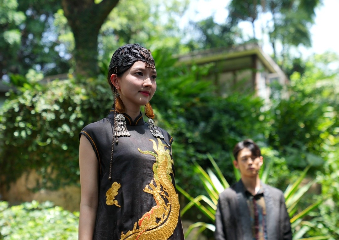 广东省十佳服装设计师凌红莲老师的云喜纱华以“山河秀色”为灵感,突破传统香云纱的深沉印象,通过缤纷色彩和现代剪裁,将非遗染整技艺与当代生活方式完美融合。来自越秀区流花街白马服装城的原创服装品牌匠品纱则呈现香云纱“三蒸九煮十八晒”的繁复工艺,延续凉爽透气的实用特性,以旗袍与中式女装展现岭南渔耕文明的千年智慧。