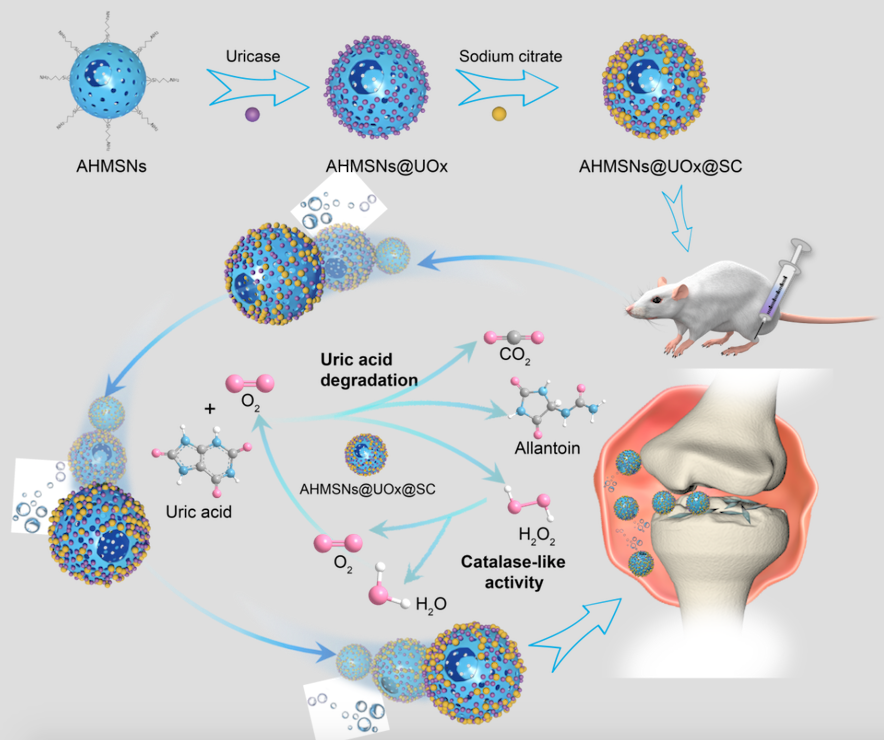 于是,可负载柠檬酸钠和尿酸酶的中空介孔二氧化硅“自驱动纳米马达”的概念诞生了,它就像一台微型机器人,在人体关节腔内一边“吃掉”尿酸,一边将有害的降解产物过氧化氢转化为无害的水和氧气,形成自给自足的“能量循环链”。