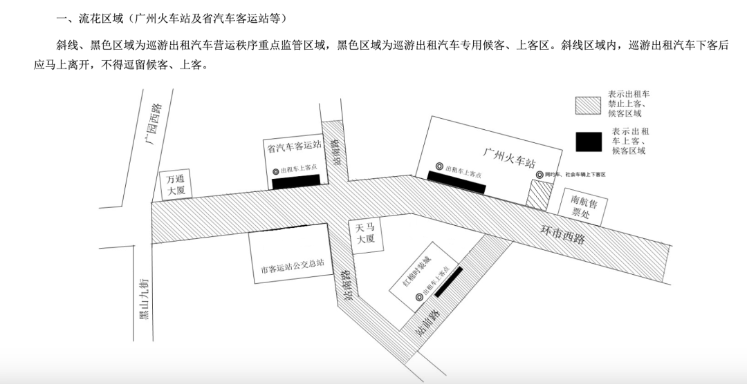 记者对比发现,流花区域(广州火车站及省汽车客运站等)相比2020年发布版本,减少了市客运站公交总站位置的巡游出租汽车专用候客、上客区;在广州火车站东侧增加了出租车禁止上客、候客区域。