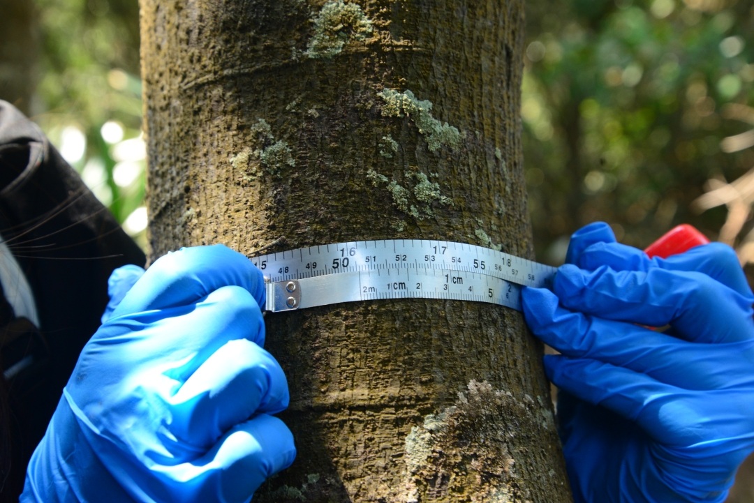 科研人员在测量花榈木的胸径