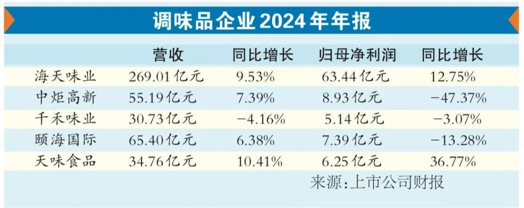 中炬高新在其财报中说道,“地方特色调味品借助电商走向全国。”同时,中炬高新还提到,当前行业呈现健康化、高端化、国际化三大趋势,有机、减盐酱油等新品占比持续提升,传统酿造技艺与现代生物技术深度融合。记者此前采访获悉,近年来,海天味业深耕健康营养产品领域,形成有机系列、减盐减脂减糖系列和营养强化系列等多个品类产品。在不断变化的消费环境下,调味品企业也需要不断根据市场调整自身策略与产品,以满足消费需求,谋求可持续发展。