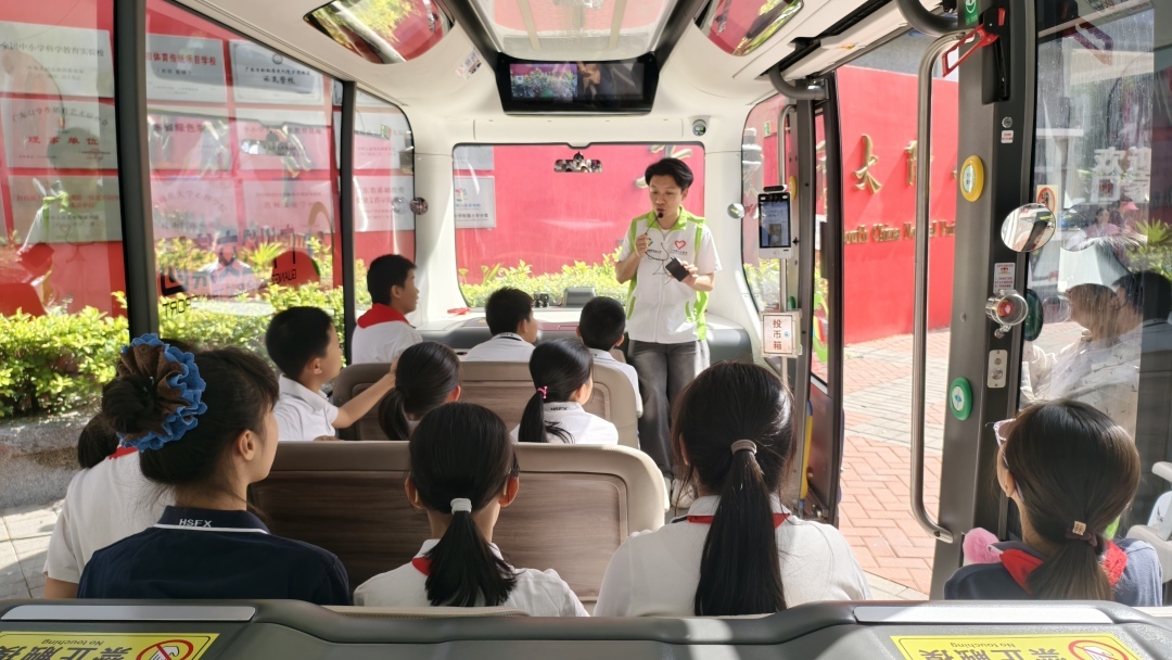 当无人驾驶的“宝宝巴士”炫酷地摆放在华南师大华师附小门前,孩子们异常兴奋。“自动驾驶、激光雷达”瞬间成为了同学们讨论的热词,来自巴士集团的青年志愿者耐心地向同学们讲解自动驾驶巴士的各种智能奥秘——“通过智能调度系统,车辆会根据实时路况和客流情况自动调整行驶路线和停靠站点”“车辆采用L4级自动驾驶技术,配备激光雷达、毫米波雷达、摄像头等多传感器融合系统,实现360度无死角环境感知”。在志愿者指引下,1-4年级的同学分批次登车体验,立体感受城市交通发展的变化。