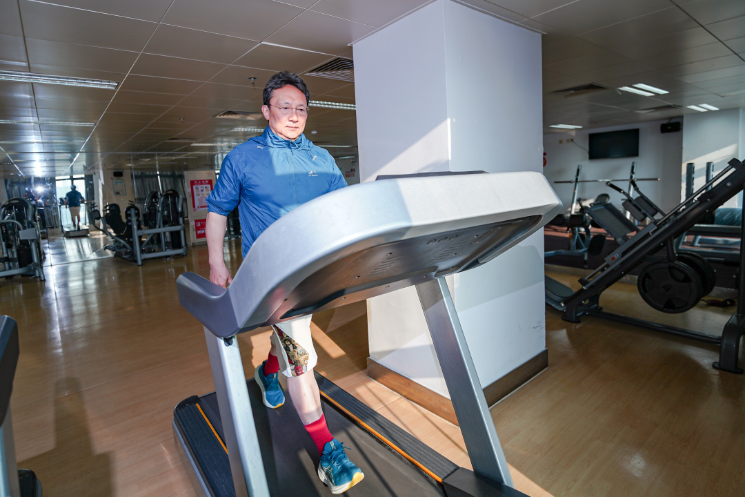 在手术等台间隙,任东林偶尔也会在跑步机上坚持运动。