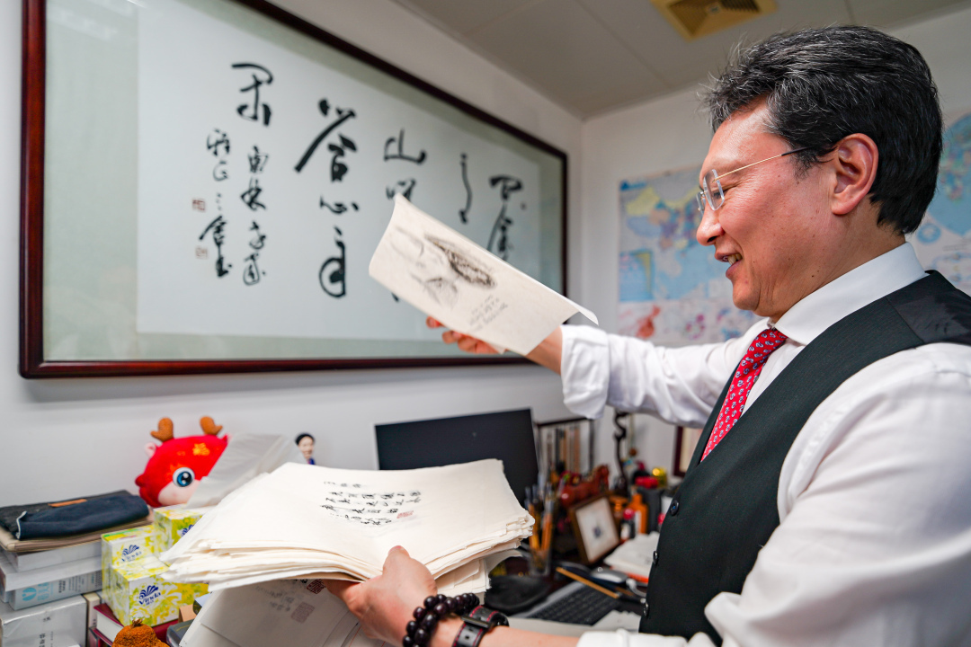 在中山大学附属第六医院肛肠外科学科带头人任东林教授的工作间,摆满了一摞摞的医学专业书籍和成果。最近,刚完成百万字肛肠外科领域书稿二稿的他,翻出了纸堆里的一些书法文字,与广州日报新花城记者分享了他忙碌医生生活的另一面。子怡是他还在读书的女儿,任东林每日写下一篇书法作品,当作是给女儿的亲笔家书,写满了365天。
