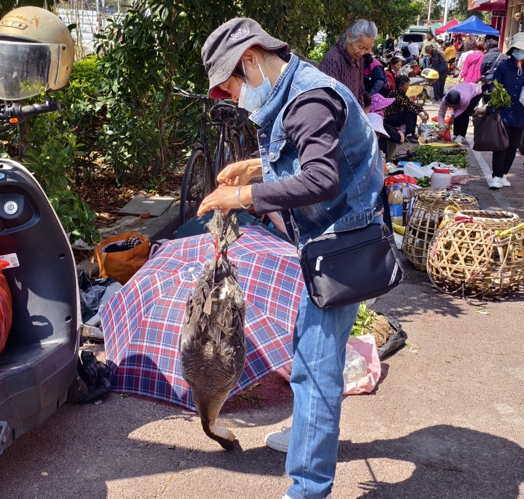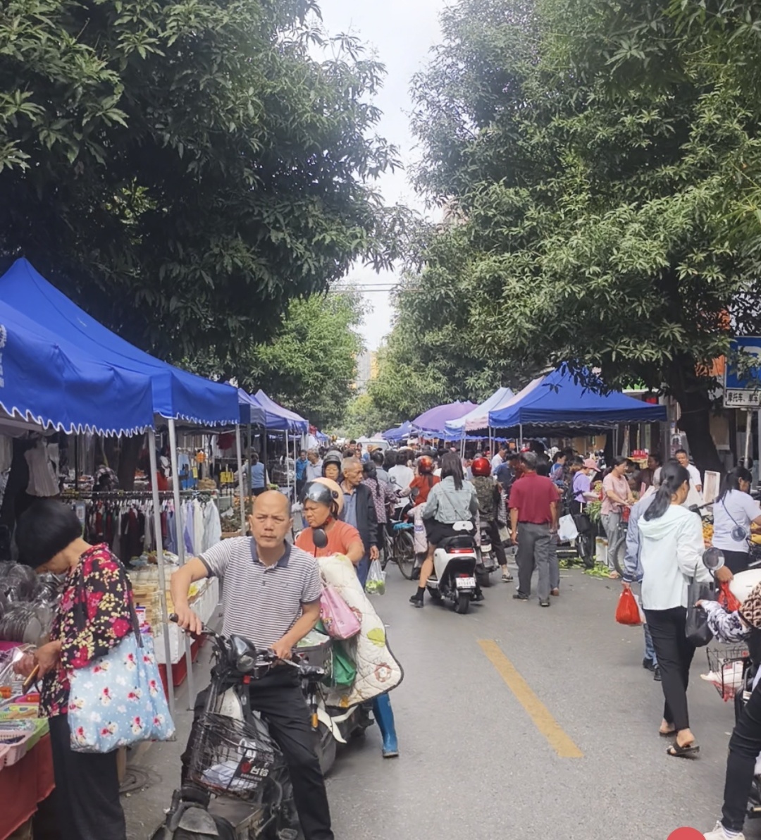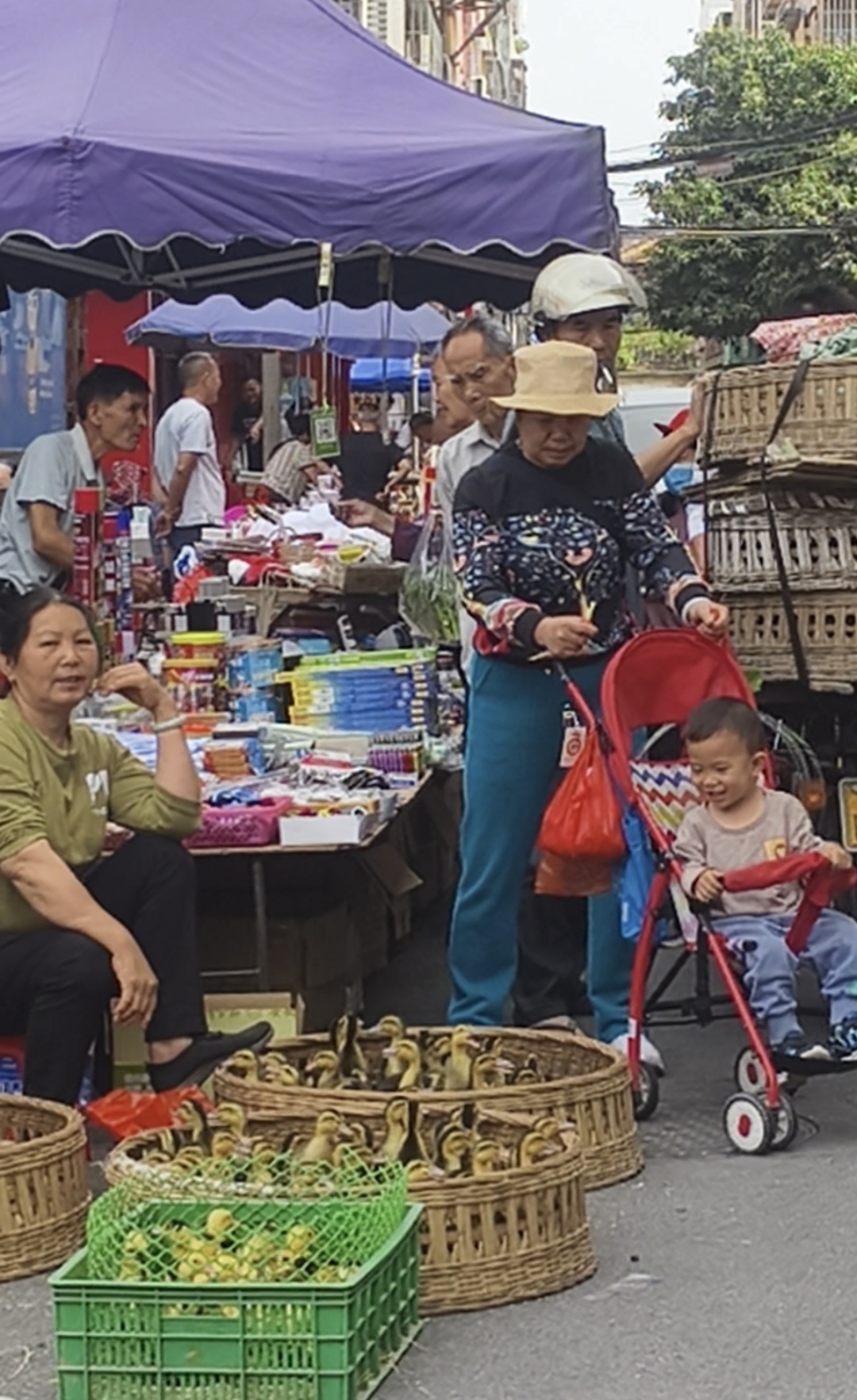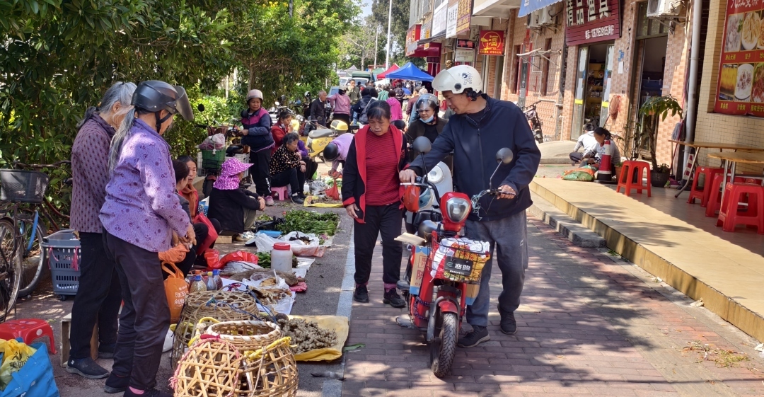 清晨七点多,当天还蒙蒙亮,在洲心街的路口已经喧哗起来,各路小贩、农户开着电动车,摩托车,农用车搭载着花苗、鸡笼、山货已经接踵而至,趁墟的热闹悄然拉开帷幕。到八点左右,附近的市民早已如约定俗成般,拖着小拖车、提着菜篮子纷纷赶来趁墟。此时的墟市,已呈现出一片繁忙景象,内街禁止机动车通行,两旁早已是摊位鳞次栉比,人群熙熙攘攘,叫卖声、谈笑声交织在一起,勾勒出一幅生动的乡村生活画卷。