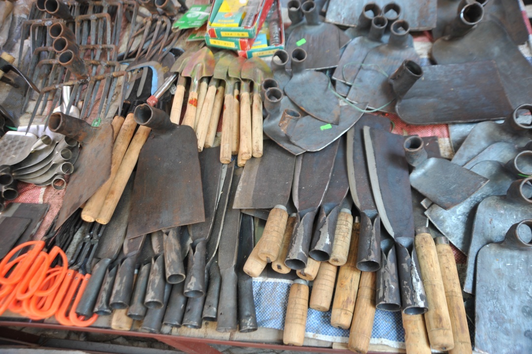 小巷不远处,是一个摆卖铁器的老字号铺子,古老的杆秤、柴刀、镰刀今天也大量上市,等候赶圩的农户前来选购,它们都是农村生活的得力帮手。