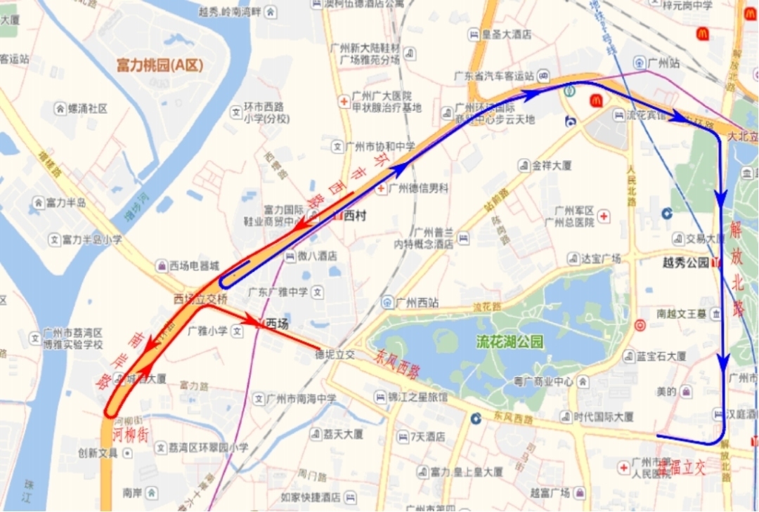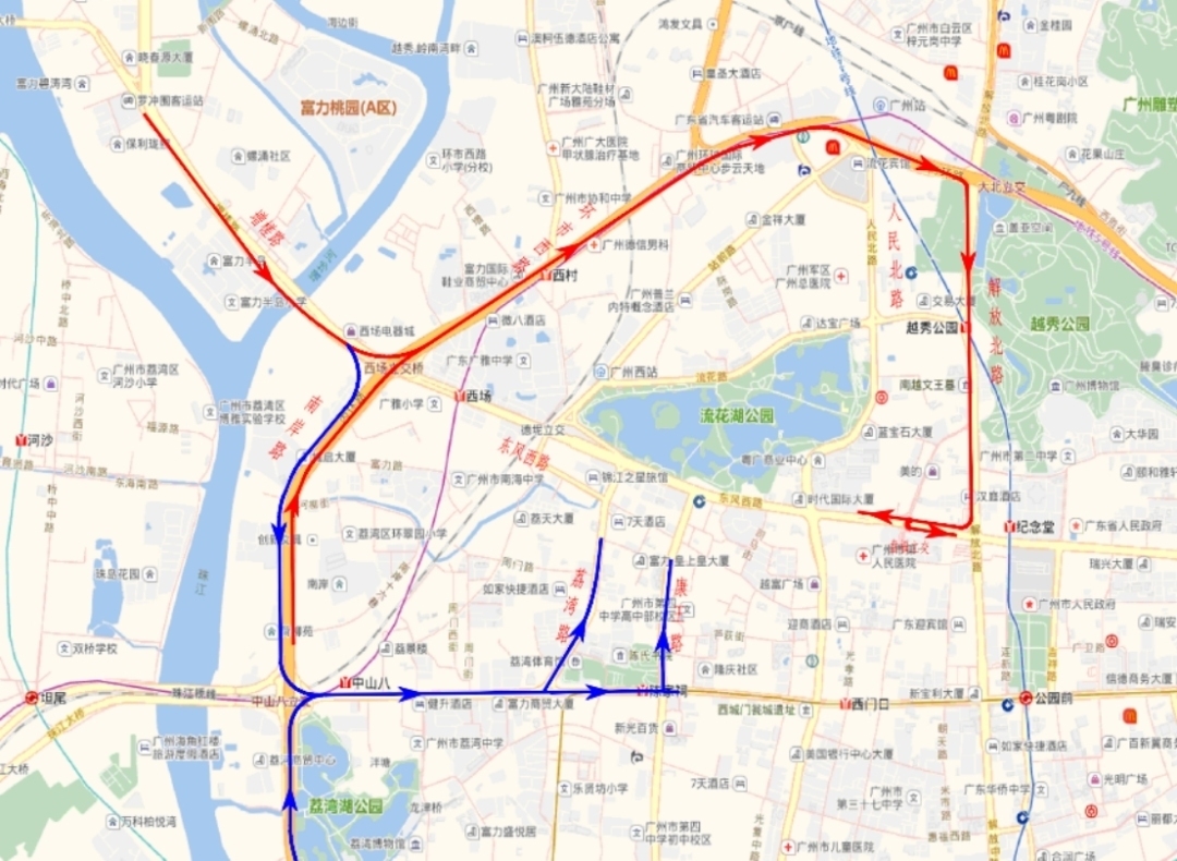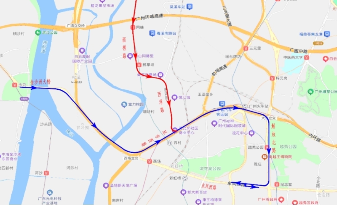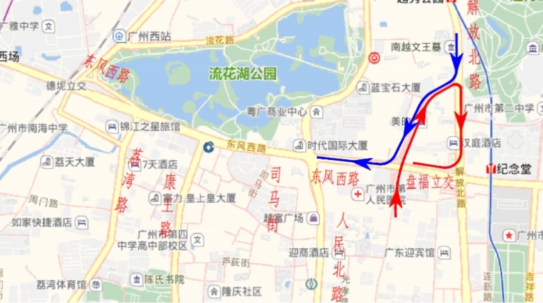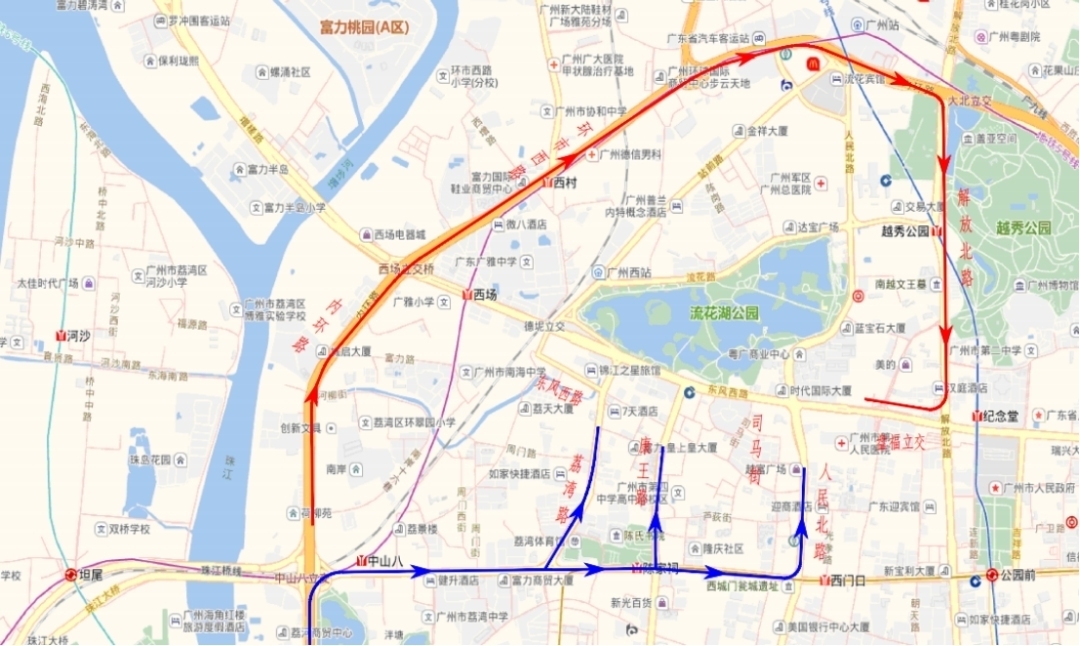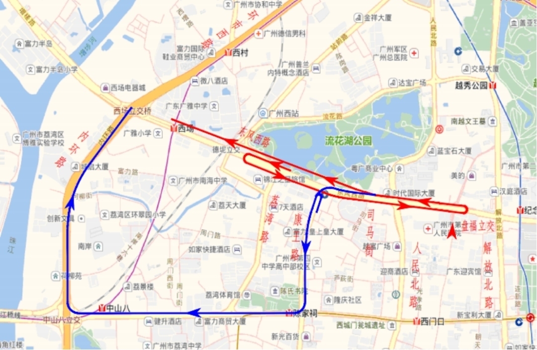 1.为减轻东风西路交通压力,金沙洲、增槎路往东风路方向车辆可绕行至环市西路,经解放北路至东风路;或绕行南岸路,经中山八路至东风路。