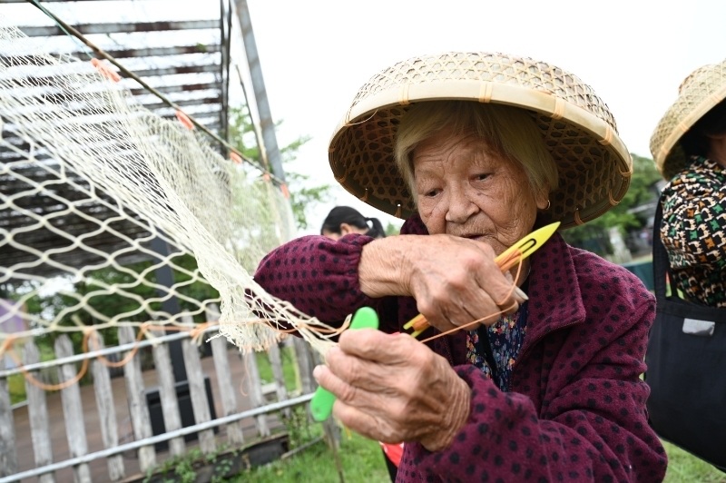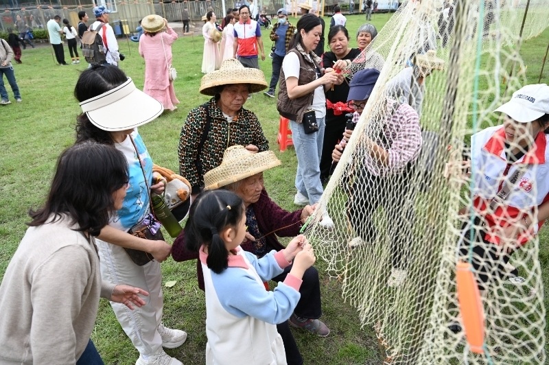 活动现场,数十组家庭齐聚一堂,在疍家老渔民的指导下,学习了起网、结扣、收边等传统织网技法。随着百人织网活动的正式开始,上百名参与者分列网纲两侧,展开了一场别开生面的织网技艺展示。