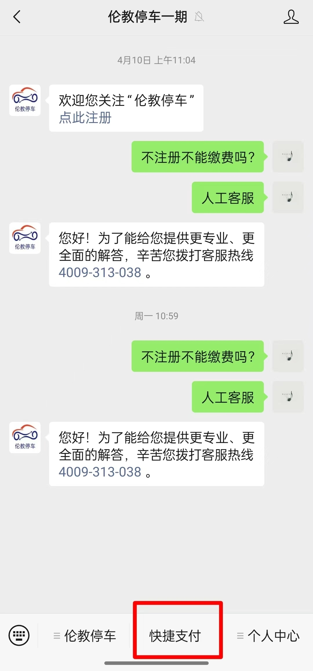 如果市民只想为自己的停车服务缴费,菜单栏中的“快捷支付”功能,总会引导市民进行注册。交个停车费还这么难?记者向公众号后台咨询,弹出的始终是同一句答复,并附有客服电话。