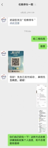 然而,钟先生的疑问还在持续。他表示,若车主在该停车系统公众号注册,还需同意“服务协议”,但该协议涉及条款众多,车主交费时一般都急着离开,不一定有时间读完全部条款,而不注册不能缴费,是否涉嫌过度收集用户信息?以私发微信方式交纳停车费,需要车主咨询客服才给解决方案是否妥当?有待商榷。