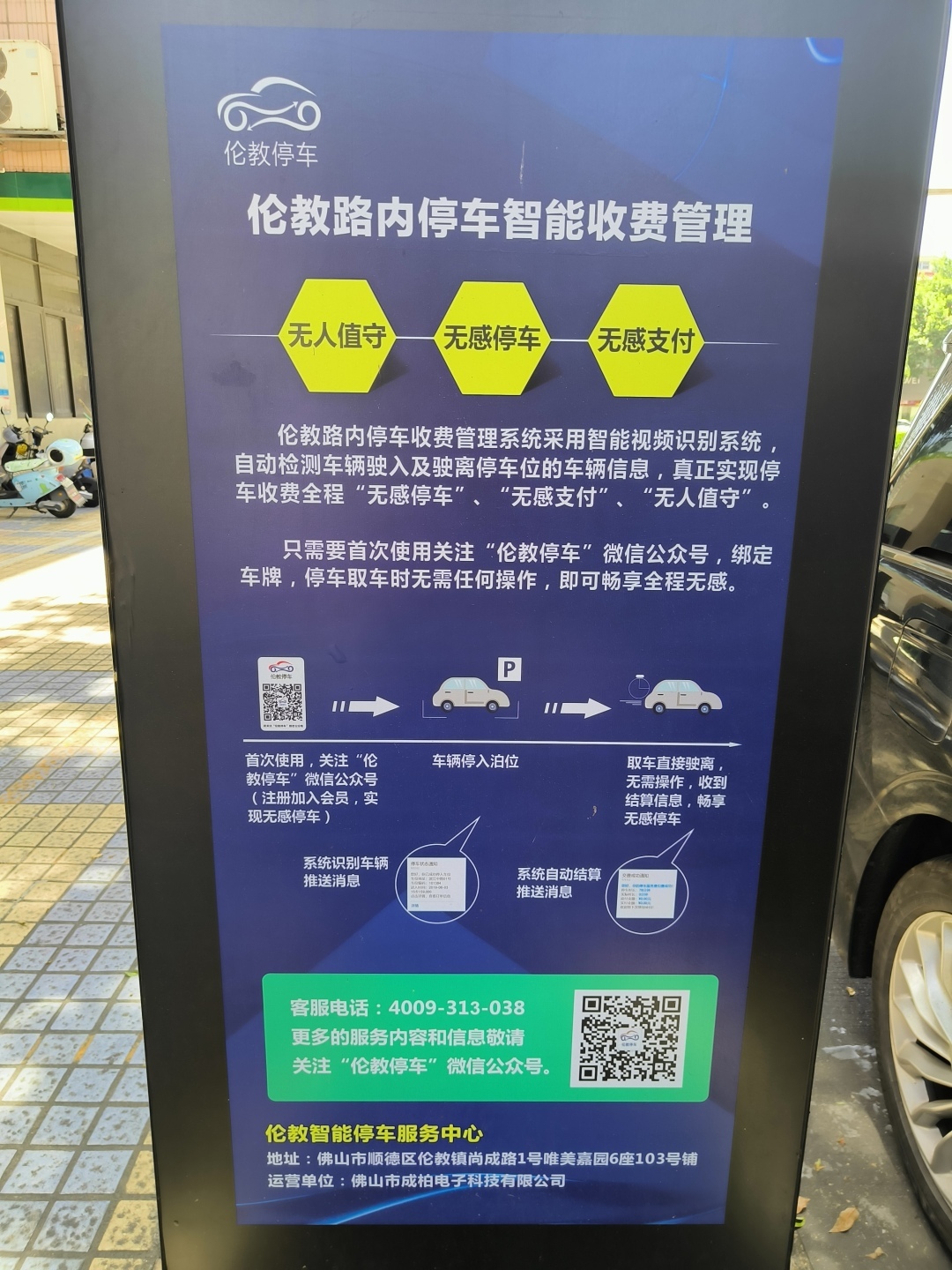 记者查询了解到,“伦教停车一期”微信公众号曾用名为“伦教停车”“喜柏停车”,2024年10月后改为现名。经了解,该停车系统运营主体为佛山市成柏电子科技有限公司。其公众号信息称,(伦教停车模式)创新市政路内停车位无人值守智能管理。