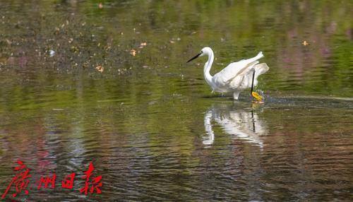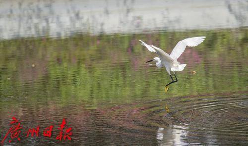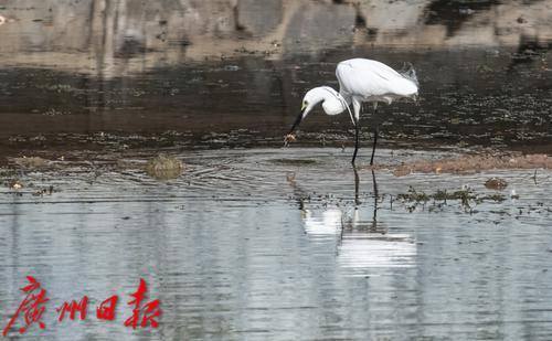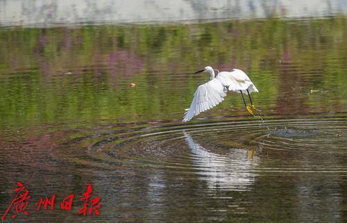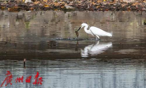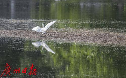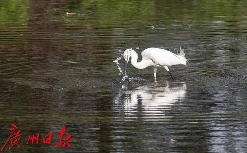 4月17日下午,流花湖公园内,一只白鹭飞临湖中浅滩,随即在周边浅水处觅食,曼妙的身姿吸引了不少游人的目光。
