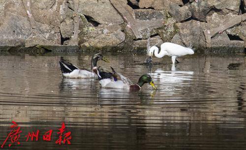 看到白鹭在此觅食,两只绿头鸭也游过来凑热闹