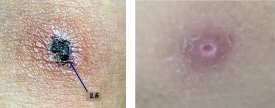 原来,医生在甄女士的右肩背部,发现了一个直径约1厘米的黑色焦痂,周围有红晕。这个不起眼的“小伤口”,成了诊断的关键线索。