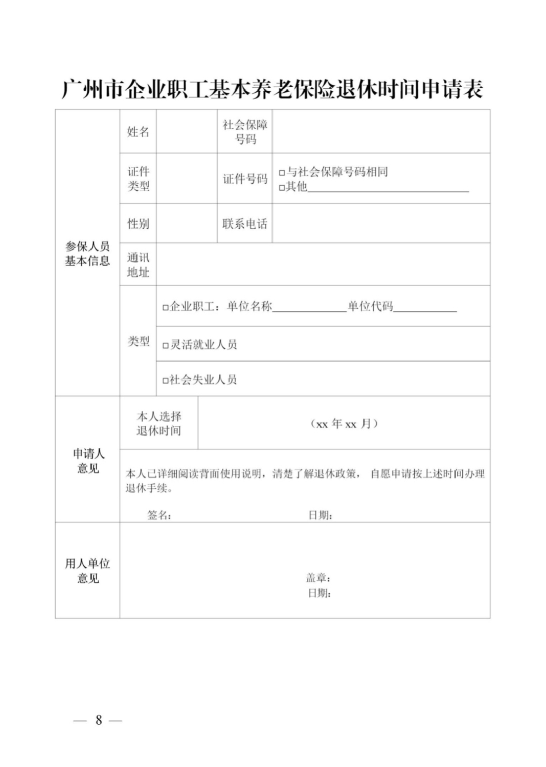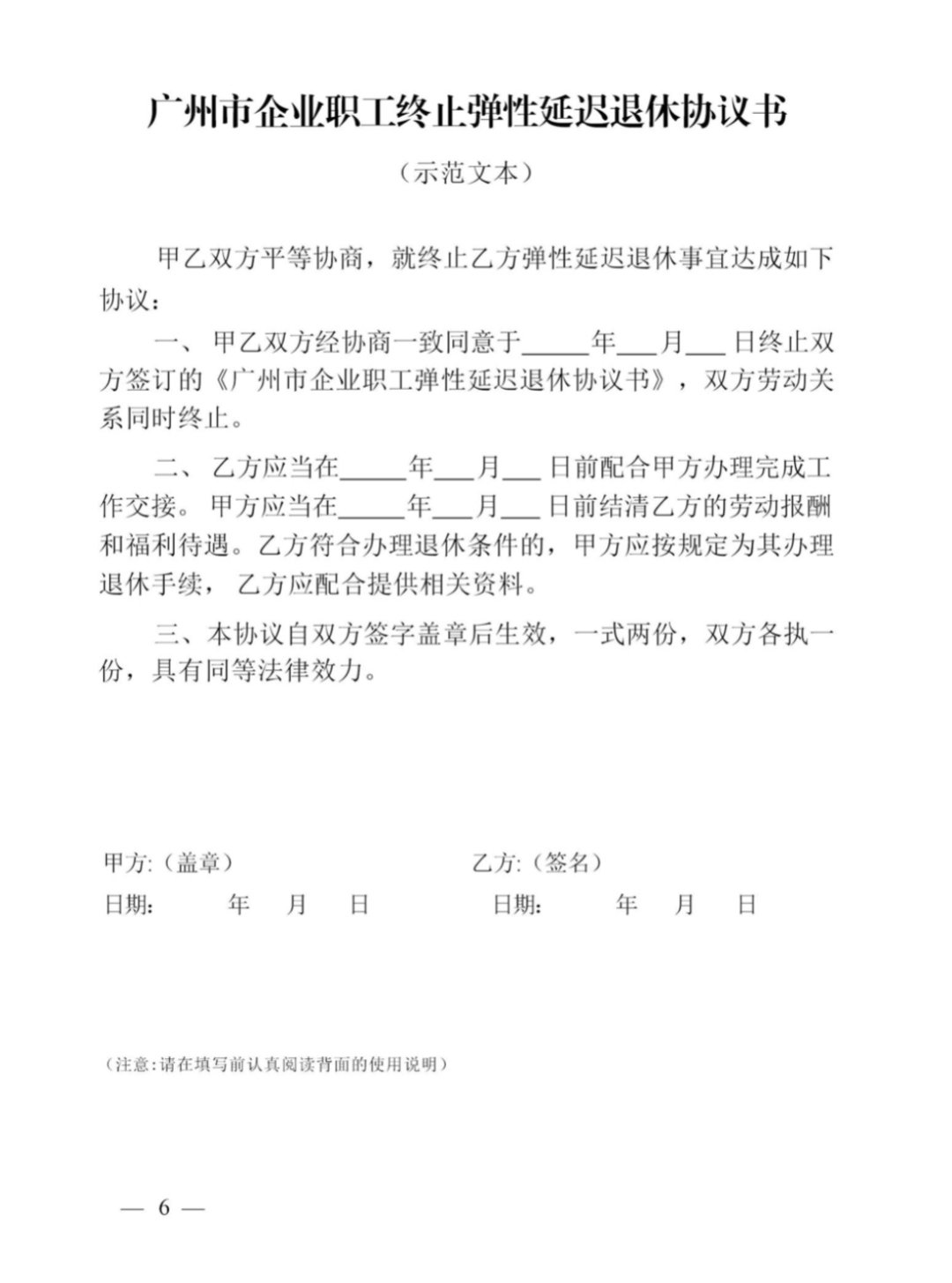 《通知》指出,根据相关规定,广州市人社局制定了《广州市企业职工弹性提前退休告知书(示范文本)》《广州市企业职工弹性延迟退休协议书(示范文本)》《广州市企业职工终止弹性延迟退休协议书(示范文本)》《广州市企业职工基本养老保险退休时间申请表》等,提供用人单位和劳动者参考使用。今后,国家和省如出台新的规定,从其规定。