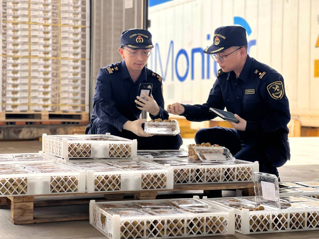 图说:大铲湾海关关员正对进口柬埔寨鲜龙眼进行现场查验。