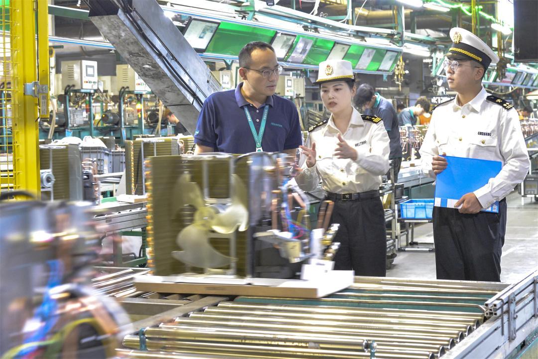 图说:江门海关所属高沙海关关员到辖区家电企业开展实地监管。