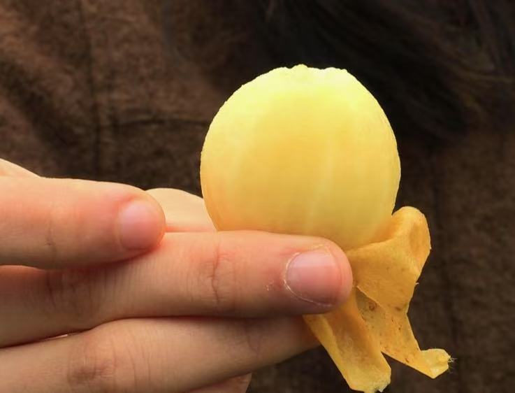 走进位于龙岗村的广州兄弟生态果园,只见一串串套着袋子的枇杷挂满枝头,拆开纸袋,黄色的果实饱满圆润。枇杷的果皮为浅黄色,表面有一层细绒毛,剥开果皮,咬上一口,果肉清甜多汁,细腻无渣,还伴随着淡淡的清香。