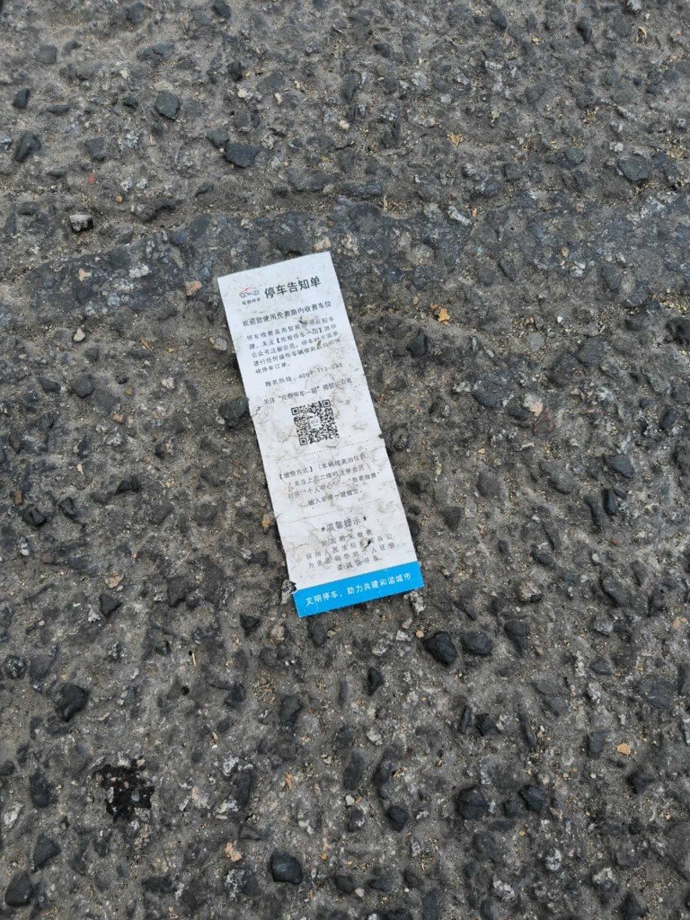 在伦教街道,被随意丢弃在地上的停车告知单,载明“为避免影响个人征信,请诚信停车”