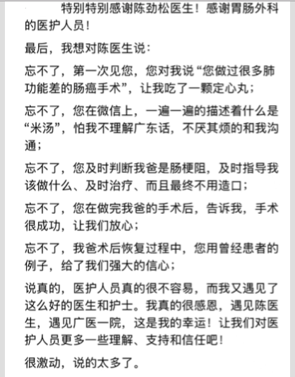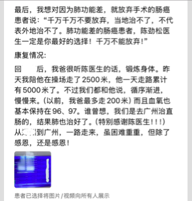 “谁曾想,我爸本来是去广州治直肠癌的,结果手术成功了,肺病也明显好转了……我们除了感恩,还是感恩!”李叔的女儿再三向陈劲松和他的团队致谢,还留下长帖分享就医经历,鼓励需要手术治疗,但因肺功能差而面临困境的肠癌患者“千万不要放弃”。
