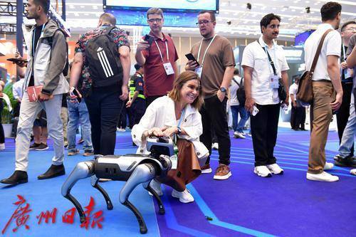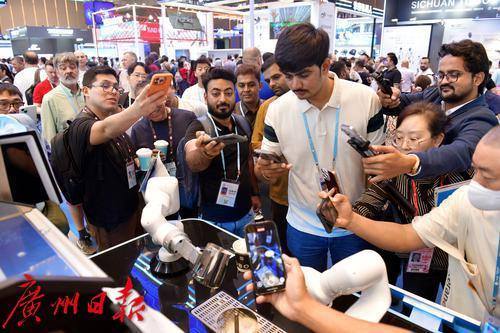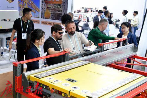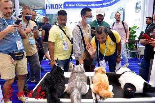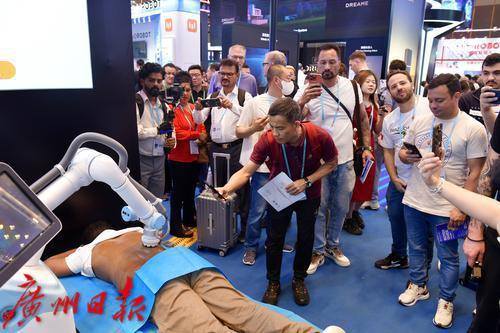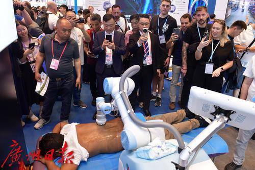 一名境外采购商体验理疗机器人,吸引了众多采购商的围观。