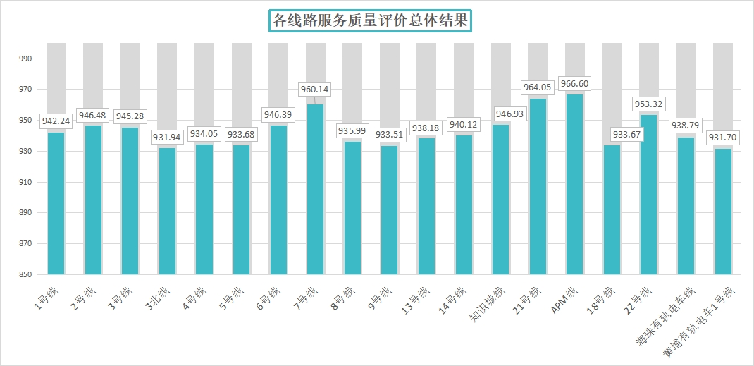 经第三方评价,“广州城市轨道交通线网”得分989.05分;运营单位中,“广州地铁集团有限公司”得分994.36分,“广东城际铁路运营公司”得分940.01分,“广州地铁交通发展有限公司”得分935.59分,与上年度相比,各运营单位得分均有所提升;受评的19条(段)线路中,平均得分943.32分,相比上年度提高0.49分(不含广佛线及2024年新开通段,3号线北延段、知识城线作为独立线路受评)。
