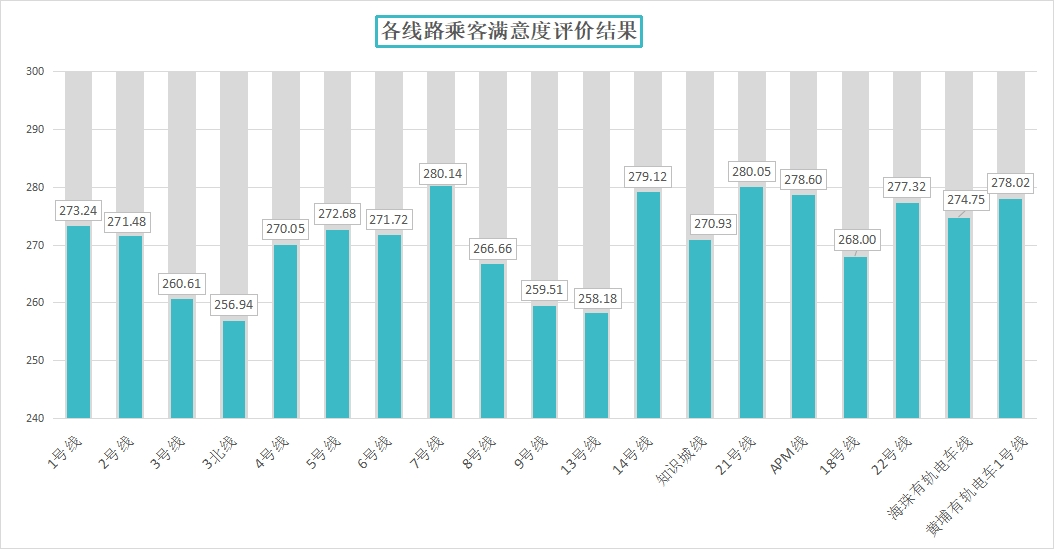 所有受评线路的“乘客满意度”平均得分为270.95分(满分300分),对应满意度90.32%,乘客满意度与上年度相比略有下降,但仍保持在较高水平。