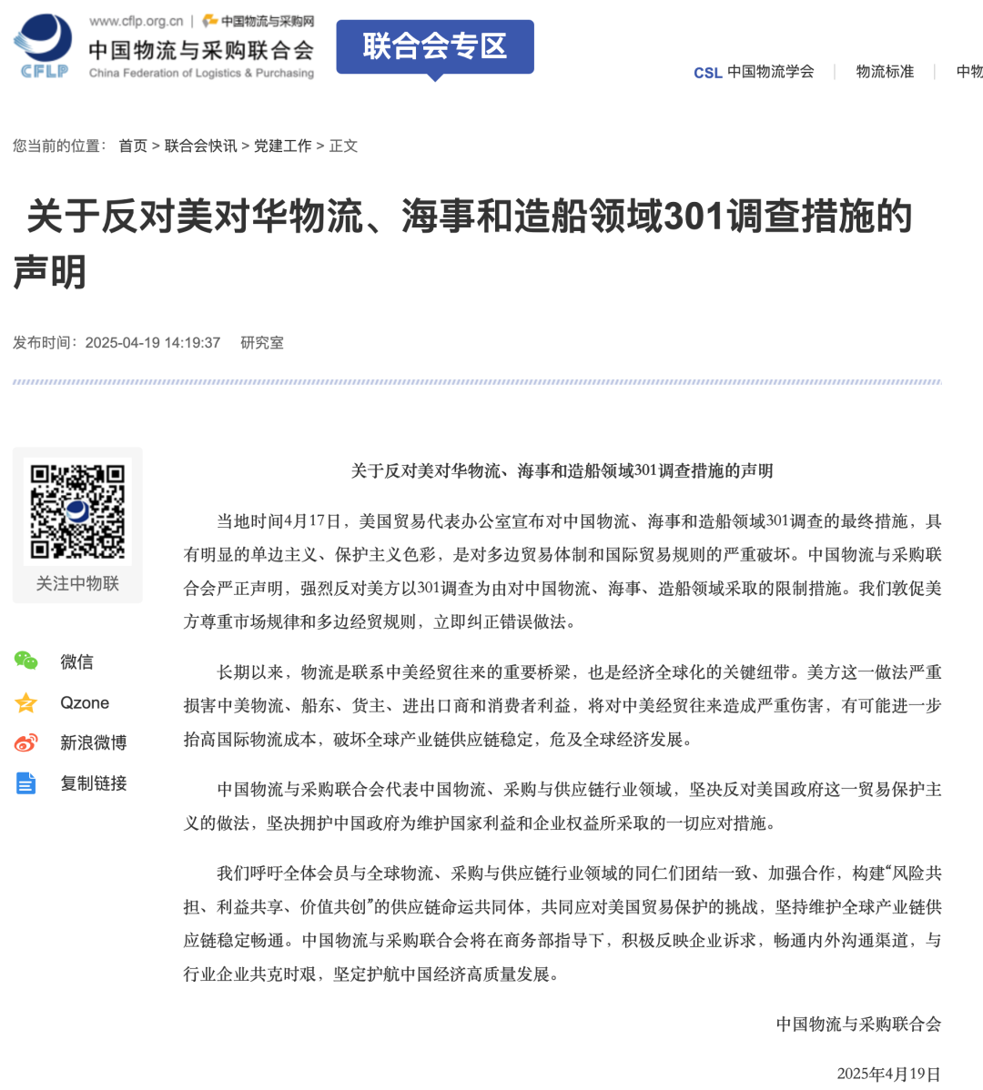 中国物流与采购联合会代表中国物流、采购与供应链行业领域,坚决反对美国政府这一贸易保护主义的做法,坚决拥护中国政府为维护国家利益和企业权益所采取的一切应对措施。