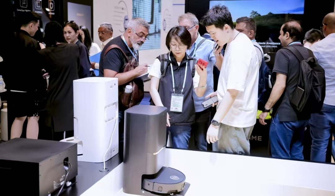 展会上,扫地机器人新品、空气净化器、泳池清洁机器人等创新产品前,人流络绎不绝。在追觅科技的展区里,多元的产品矩阵及多项创新技术受到了采购商们的关注。扫地机器人系列无疑是最受瞩目的焦点之一。采购商们饶有兴趣地看着行业首创的仿生双机械足如何能够轻松越过最高6厘米的门槛和地台,实现全屋清洁无阻碍。据介绍,在追觅X50 Pro扫地机器人上搭载了自升降全景激光雷达和顶配避障方案,能够精准识别并避让超过200种障碍物,确保清洁过程中的安全高效。另一边,创新的热水拖地技术和100℃高温灭菌洗拖布功能也十分吸睛,采用了航天级储能热水拖地技术,让拖布快速吸热并持久锁热,实现40℃热水拖地,有效去除地面油污和顽固污渍。