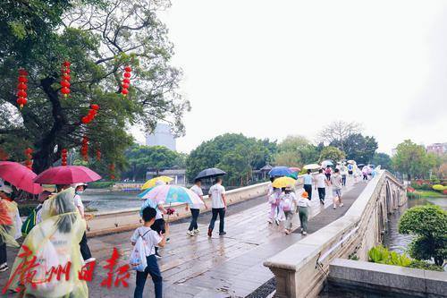 徒步队伍行进到荔湾湖公园的五秀桥。