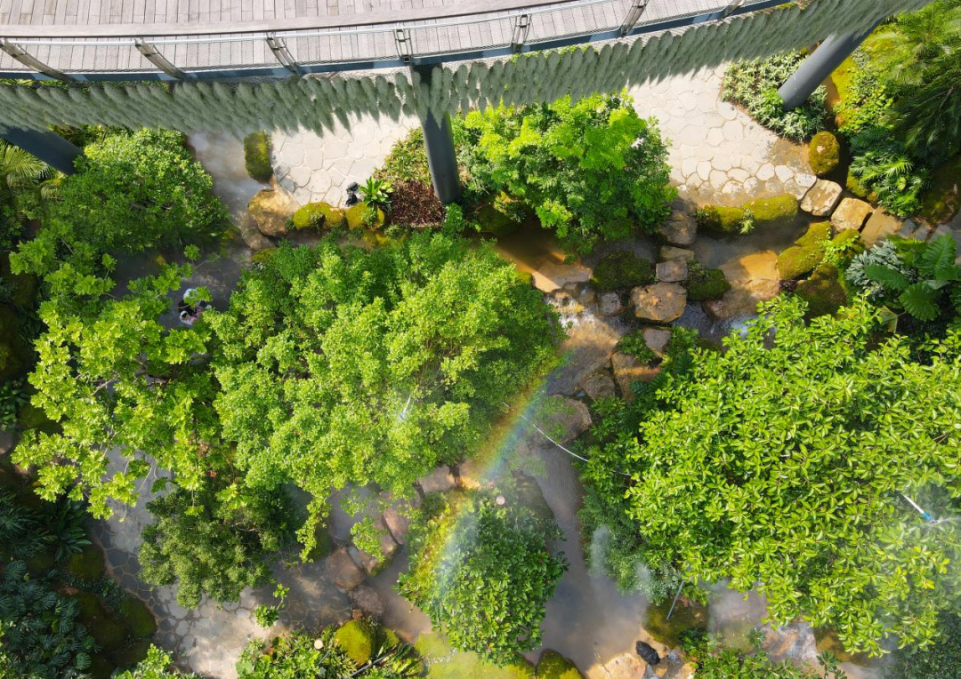 幸运游客张女士还是首位“雨林造雨”体验官。随着张女士步入雨林植物专类园,人工雨系统正式启动。当智能人工降雨系统与自然阳光产生联动时,水雾粒子将精准折射光线,在每天10:30-10:45,15:30-15:45的晴好时段,实时生成彩虹。