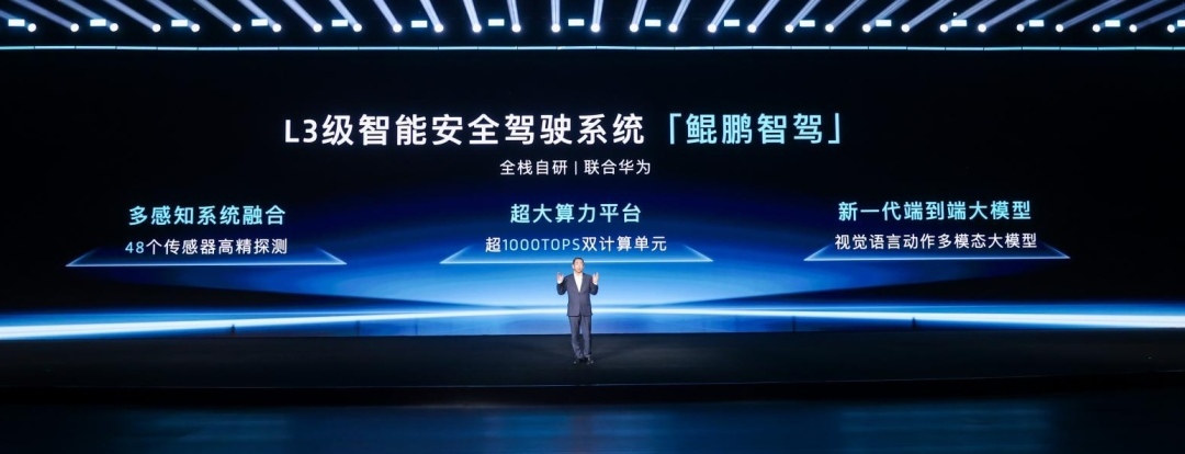 鲲鹏L3级智能安全驾驶系统,基于鲲鹏瞰视网络、鲲鹏九算大模型和鲲鹏万象平台3大核心模块,构建新一代智能驾驶系统。该系统搭载超700线激光雷达与1000TOPS双芯片算力平台,实现100米外识别15厘米物体、时速160公里情况下AEB紧急制动,其性能较L2级提升30%以上。其多模态感知融合算法可在雨雾、逆光等极端环境下保持99.9%的目标识别率,结合端到端大模型与边缘计算技术,决策延迟从传统方案的1.2秒降至0.3秒。15厘米物品识别能力提升至100米;复杂交通标识识别、自主找车位、自动接驾等。