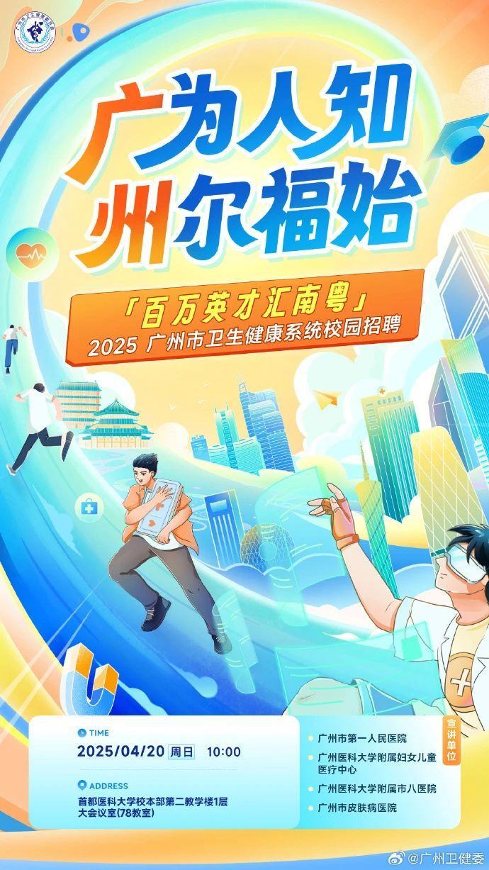 4月19日至20日,“百万英才汇南粤”2025年N城联动春季招聘活动(北京站)启动。20日,广州市卫生健康系统将在首都医科大学举行宣讲会和双选会。广州日报新花城记者了解到,广州市卫生健康委本次首次集结医学高等院校、公立三甲医院、顶尖公共卫生机构、高水平民营医院、生物医药高科技服务企业等用人单位近30家,提供1212个优质岗位,其中博士、硕士需求占比超过八成;增设AI医疗、健康大数据等新兴交叉学科岗位,紧贴医疗行业前沿趋势。招聘采用“线下深度对接+线上智能匹配”双轨模式,探索校地合作,推动长效人才培养机制;并对符合条件的人才提供“安家落户”专项支持及科研启动资金等配套,为签约学生提供岗前培训、定期回访等持续支持。
