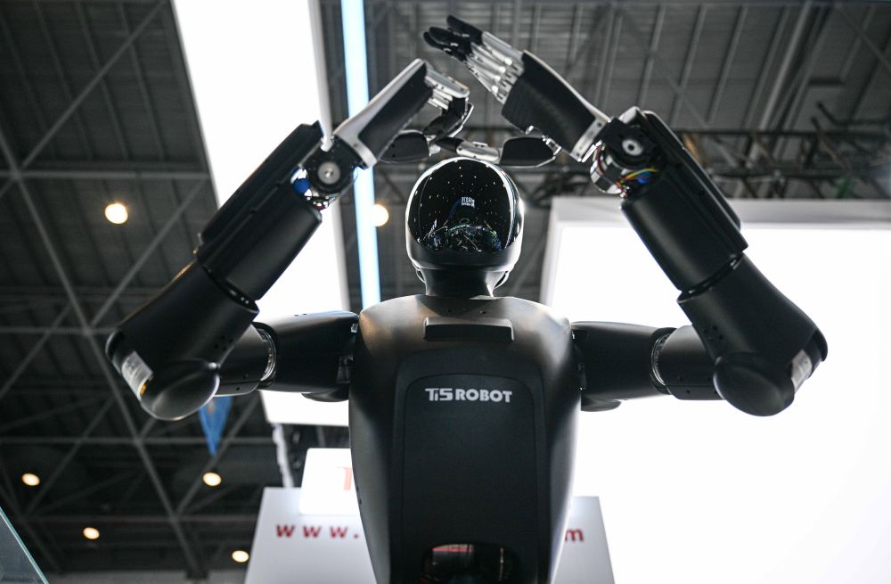 ▲4月14日在第五届消博会上拍摄的做出抱拳手势的机器人