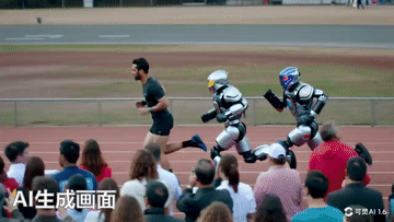 如果用AI技术生成一个“人机共跑”画面,机器人仿佛快赶上人类的速度。
