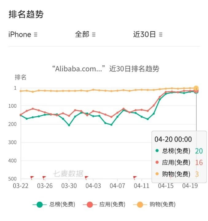4月20日,据七麦数据,阿里国际站(即Alibaba.com)已经超越沃尔玛,成为了美国App Store中免费购物软件下载量第三的应用,至此该榜单前三名已经被中国电商平台“霸榜”,排在阿里国际站前面的分别是淘宝和敦煌网。