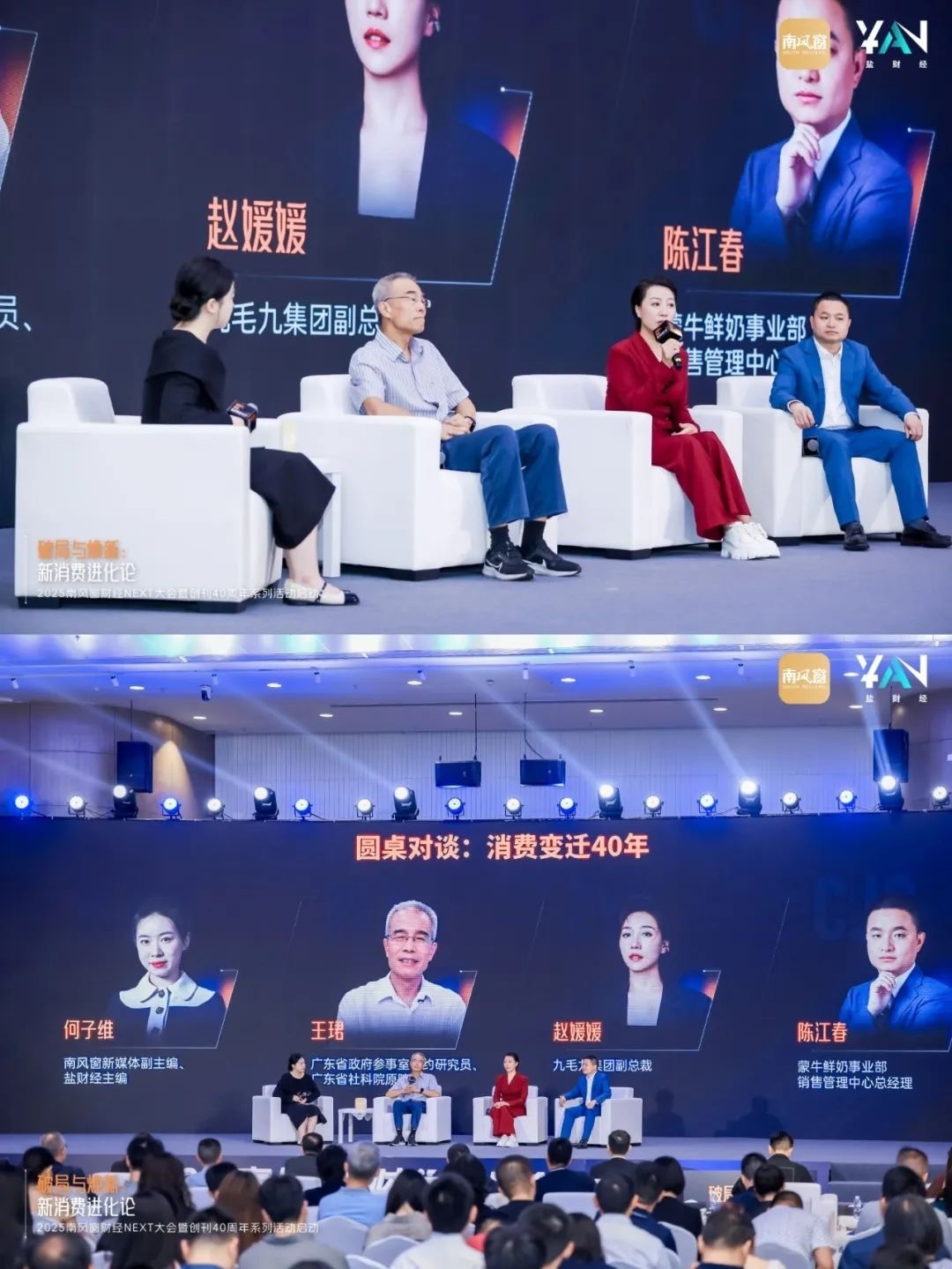 在多场干货十足的主题演讲之后,一场探讨消费市场成长轨迹与未来方向的高端对谈,展示出新消费的无限可能。围绕着“消费变迁40年”这一主题,广东省政府参事室特约研究员、广东省社科院原院长王珺,九毛九集团副总裁赵媛媛,蒙牛鲜奶事业部销售管理中心总经理陈江春展开精彩对话,多角度、多维度深入讨论新消费的进化之道。