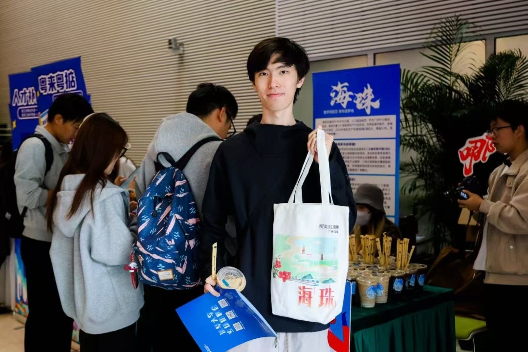 “捞乜都掂——无论做什么都能成功”,在文化体验区,学子们跟着老师现场体验粤语趣味教学,沉浸式领略岭南文化魅力。通过参与现场活动和投递简历,可集海珠名片章,兑换海珠国家湿地门票、海珠文创产品、咖啡奶茶和清华校园周边影院电影券。来自清华大学社会学专业的大四学生雷同学表示:“我很喜欢岭南文化,毕业后希望去广州、深圳发展,这次活动也让我对海珠区有了更深的了解。”