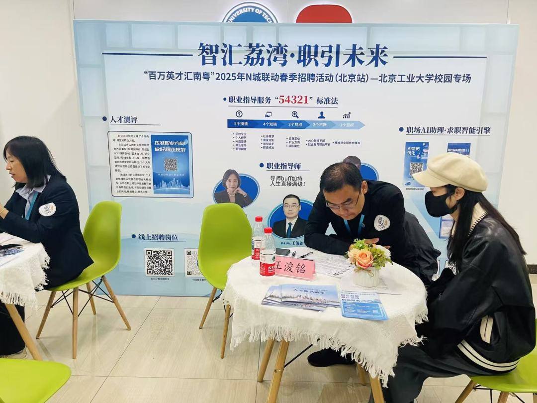春风十里,不如来“荔”!4月20日,广州市荔湾区“人才专列”驶入北京工业大学(平乐园校区)与北京中医药大学(西校区),下午继续停靠在中国人民大学人才港湾,以“荔展宏图,湾区筑梦”为主题,正式开启“北京站”荔湾专场校园引才活动。招聘活动现场会集广州工控集团、广药集团等25家名企,还有13家事业单位,提供1100余个高薪岗位,覆盖智能制造、生物医药等多个领域。现场气氛火爆,吸引上千人驻足,仅北京工业大学(平乐园校区)站点就收到人才简历600余份,达成就业意向 200余人。