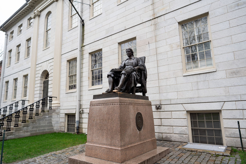这是2024年4月20日在美国马萨诸塞州剑桥的哈佛大学校园里拍摄的哈佛大学创始人约翰·哈佛的雕塑。新华社记者刘杰摄